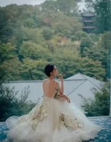 纱裙作为造型的核心,选用轻盈通透的材质,多层薄纱叠加出朦胧的层次感,行走间裙摆随风轻扬,飘逸如云。裙身精致的刺绣是点睛之笔——
